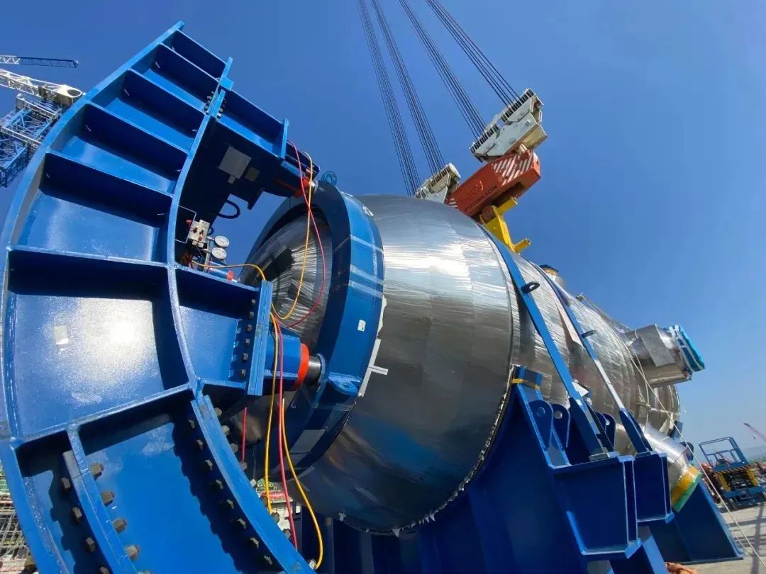 容器组件净重约316t,外形尺寸约为6840mm*6324mm*10375mm,吊装重量461.8吨,翻转、吊装、就位难度极大。项目团队优化压力容器保温层施工逻辑,缩短了设备翻转吊装时间,采用新型一体化e型翻转装置,在地面完成翻转竖立-拆除抱环-提升等一系列动作,提高了压力容器一次吊装成功的安全性。