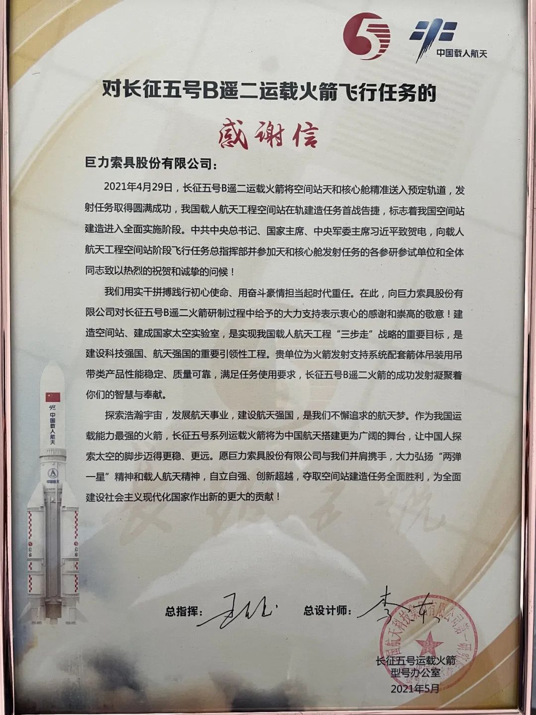 日前,bet356的官方网站中文版索具股份有限公司收到中国航天科技集团第一研究院发来的感谢信,向bet356的官方网站中文版索具对长征五号B遥二运载火箭飞行任务和研制过程中给予的大力支持表示衷心的感谢。
