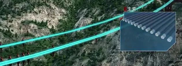 全桥两组主索组成一套吊装系统,每组主索为12根直径60毫米的钢芯钢丝绳并有相应的两根直径28毫米纤维芯起重索,两根直径32毫米纤维芯牵引绳等与之配套,整套系统共四个吊钩,以便于进行拱类姿态调整。