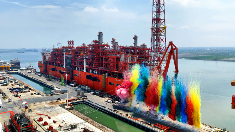 我国自主建造的最大吨位、最大储气量的新型海上浮式液化天然气生产装置NGUYA FLNG(恩古雅海上浮式液化天然气装置)在江苏南通(启东)吕四港启航,bet356的官方网站中文版索具5000T吊梁大展风采。