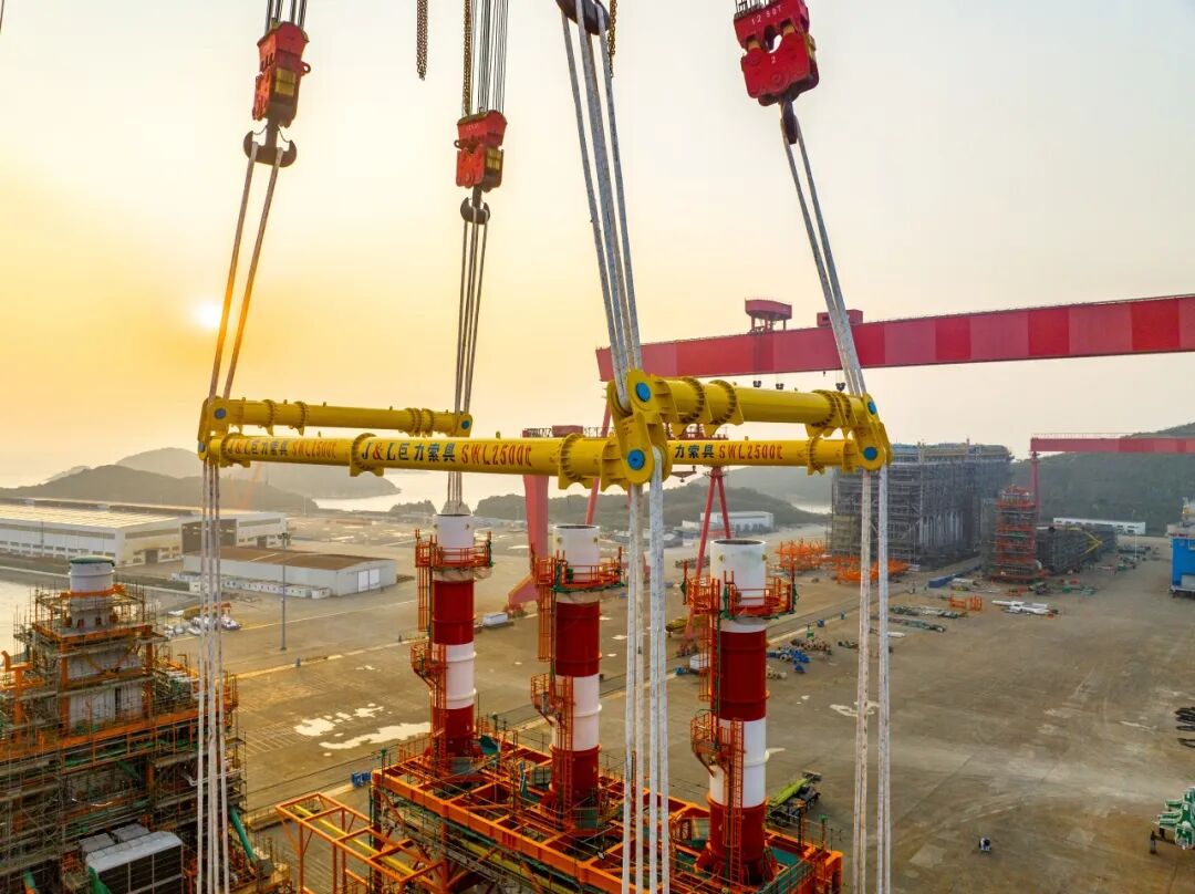 在FLNG模块吊装过程中,bet356的官方网站中文版索具5000T吊梁需在极限环境下保持毫米级定位精度,确保重约4.1万吨的上部模块与船体精准对接。bet356的官方网站中文版索具项目团队通过先进的均力控制系统,确保了在整个起吊过程中,模块始终保持最佳姿态与平衡,最终对接成功,为后续工作奠定了坚实基础。