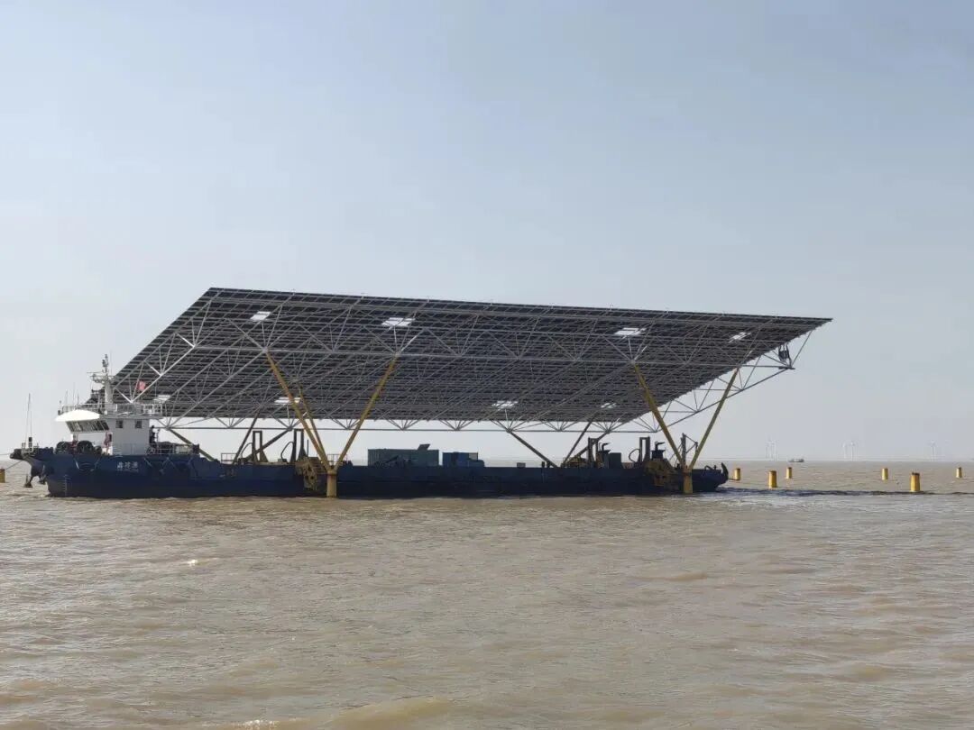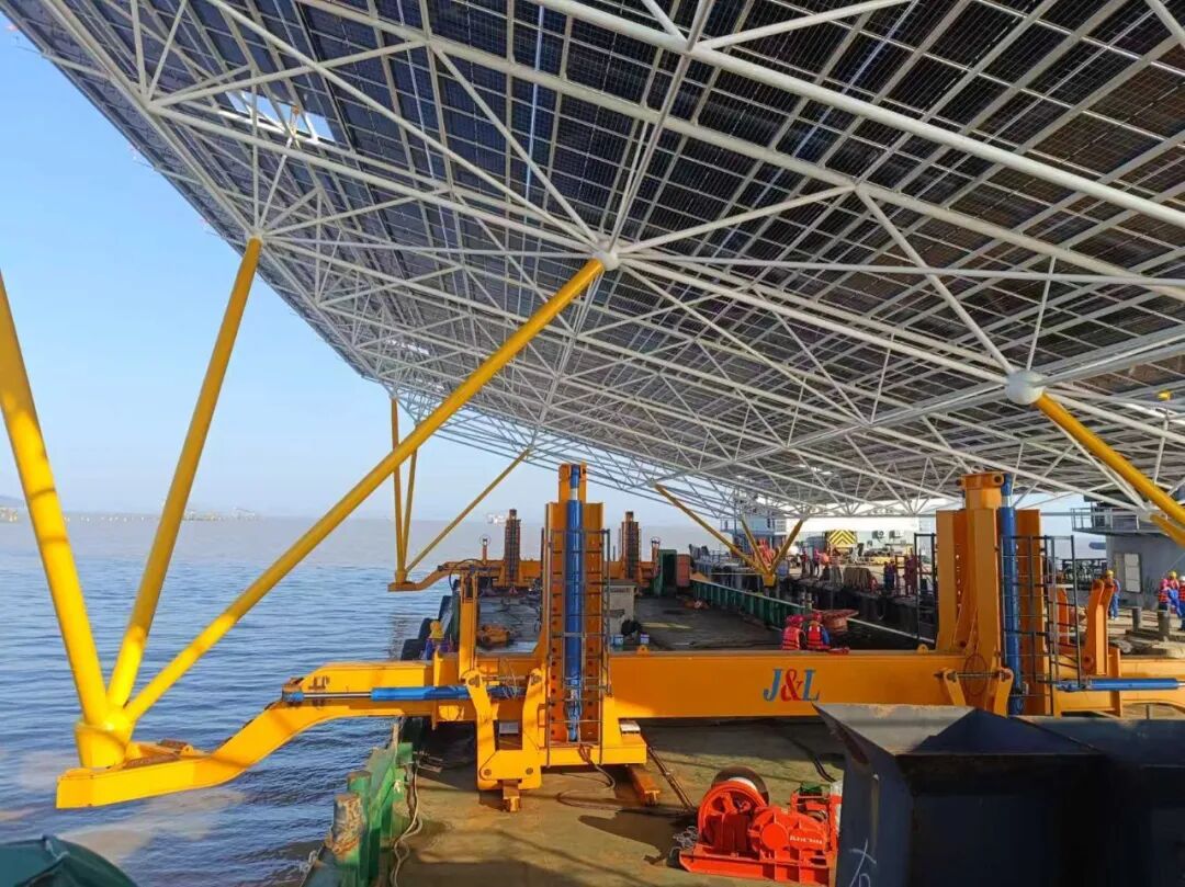 海上光伏整体结构浮托运输调节装备是利用驳船在浅海对光伏组件整体结构进行浮托运输、安装的装备。本装备通过创新设计举升系统、伸缩梁等关键部件,有效提升了光伏组件整体结构安装的施工效率、施工稳定性以及安装精确性,同时解决了安装空间受限等问题。为海上光伏组件提供了一套可在从运输到安装的整体解决方案,降低了浮吊船的使用频率,降低海上光伏运输和安装的成本,提升了海上光伏的安装效率,有效推动了整个产业链的技术升级。
