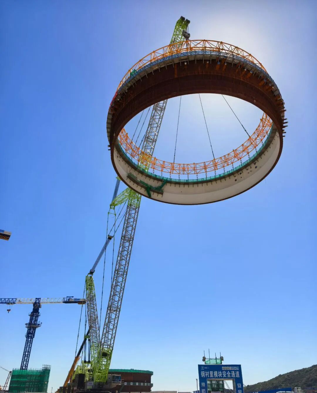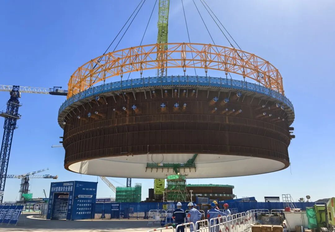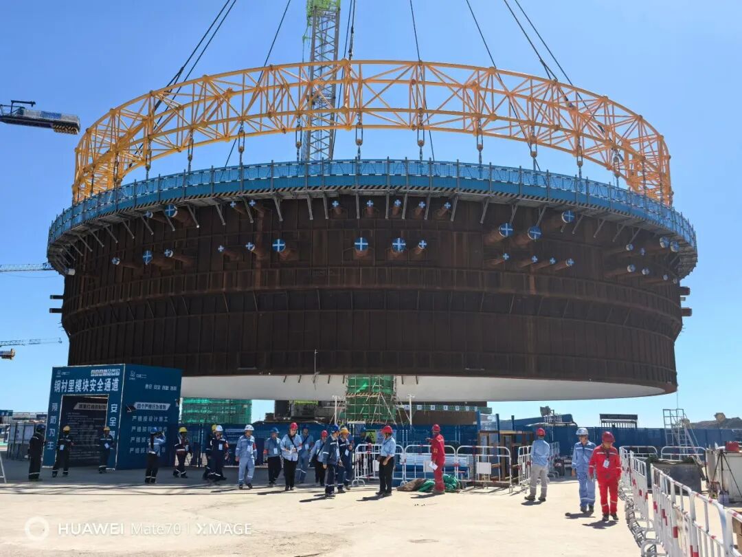 历经4个小时的奋战,金七门核电1号机组钢结构安全壳钢衬里模块一平稳吊装就位,为核岛反应堆厂房内部结构和内外壳并行施工奠定了坚实基础。