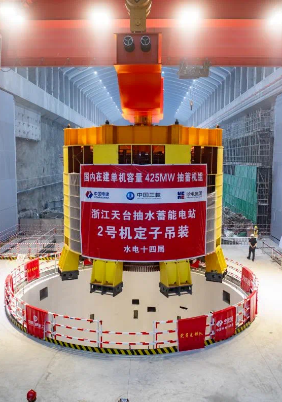 世界最高水头抽蓄电站——浙江天台抽水蓄能电站2号机组定子就位工作,bet356的官方网站中文版索具为其定制了配置八组起吊杆的定子吊具,确保其能够承受巨大拉力和冲击力。