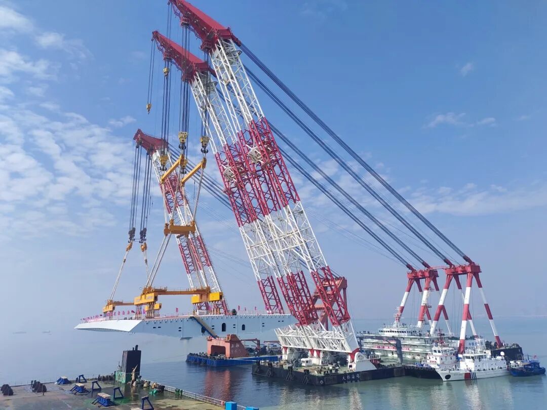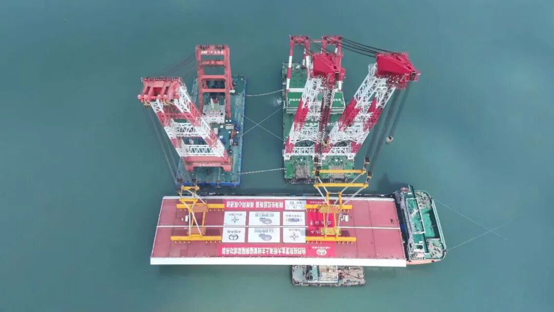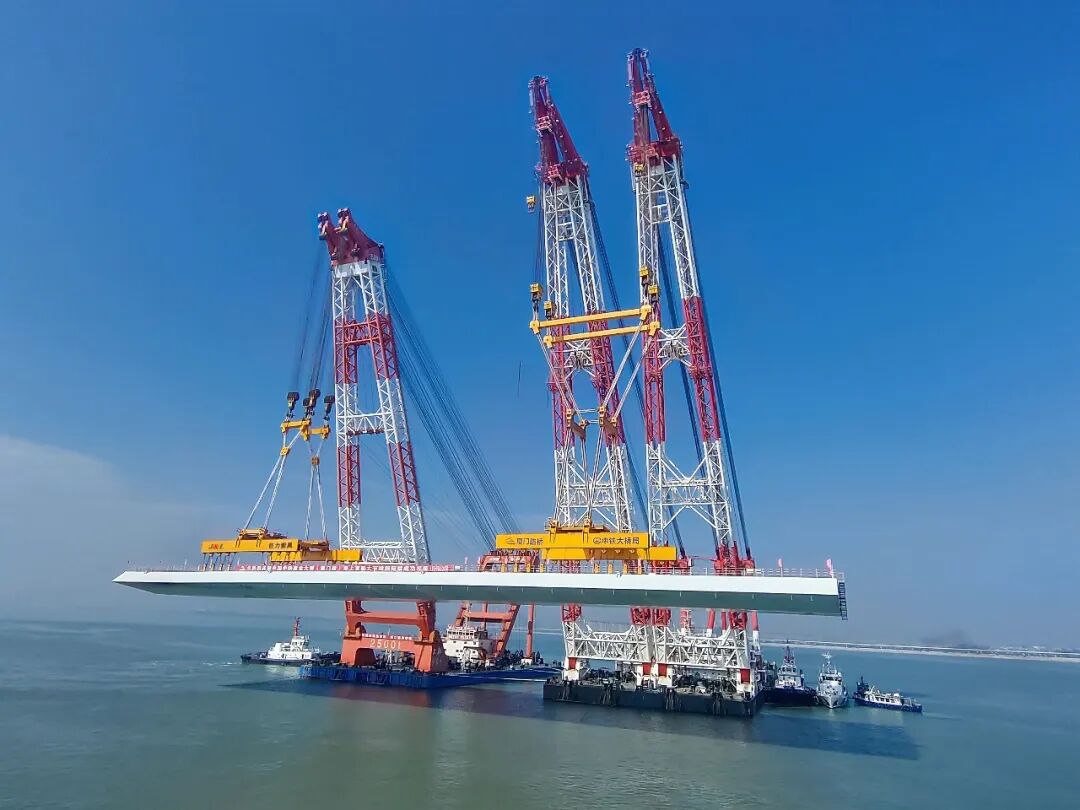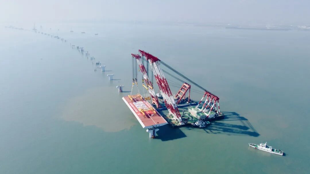 厦金大桥(厦门段)总长约19.6公里,本次吊装的钢箱梁位于大嶝西航道桥东侧的90-91号墩,梁长142.5米、宽44米、高4.5米,总重量4586吨,堪称“海上巨无霸”。该梁段的成功架设,刷新了海上装配式桥梁整孔架设钢梁的重量记录,也为行业内浅滩海域“智能装配化”造桥提供了重要实践。