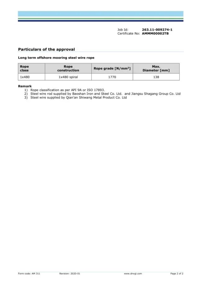 此项产品认证成功,标志着我公司深海工程用单股钢丝绳产品技术实现了巨大跨越,填补了国内空白,增强了市场竞争力,为国产系泊品牌进军深海系泊领域奠定了坚实基础,具有长远的社会经济效益。