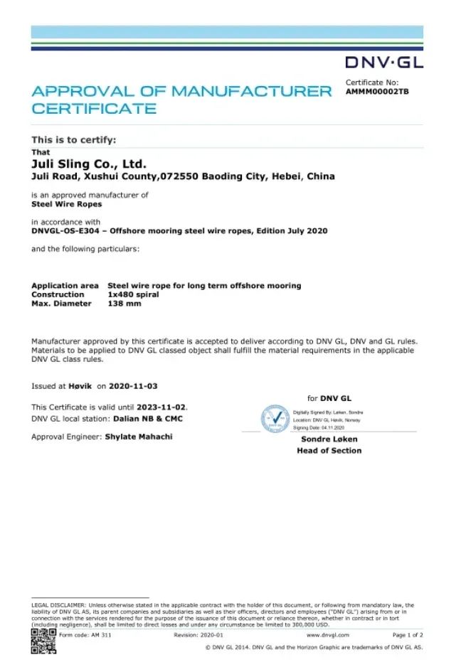 2020年11月,bet356的官方网站中文版索具取得了永久系泊用单股涂塑钢丝绳的DNV·GL工厂认可证书,成为国内首家通过该类钢丝绳DNV·GL工厂认可的厂家。